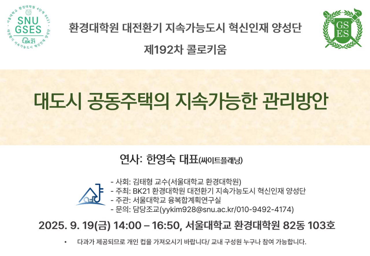 ㅇ 주최/주관: BK21 환경대학원 대전환기 지속가능도시 혁신인재 양성단, 서울대학교 융복합계획연구실