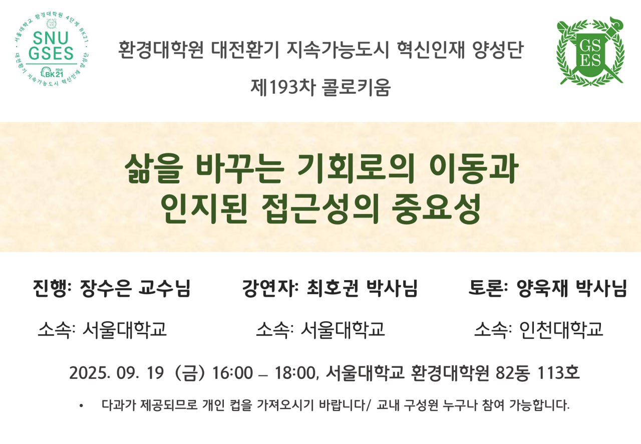 제193차 BK콜로키움: 삶을 바꾸는 기회로의 이동과 인지된 접근성의 중요성(최호권 박사 / 서울대학교 BK 사업단)