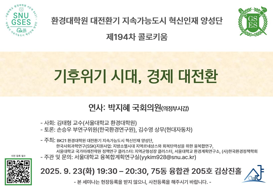ㅇ 주최/주관: BK21 환경대학원 대전환기 지속가능도시 혁신인재 양성단,