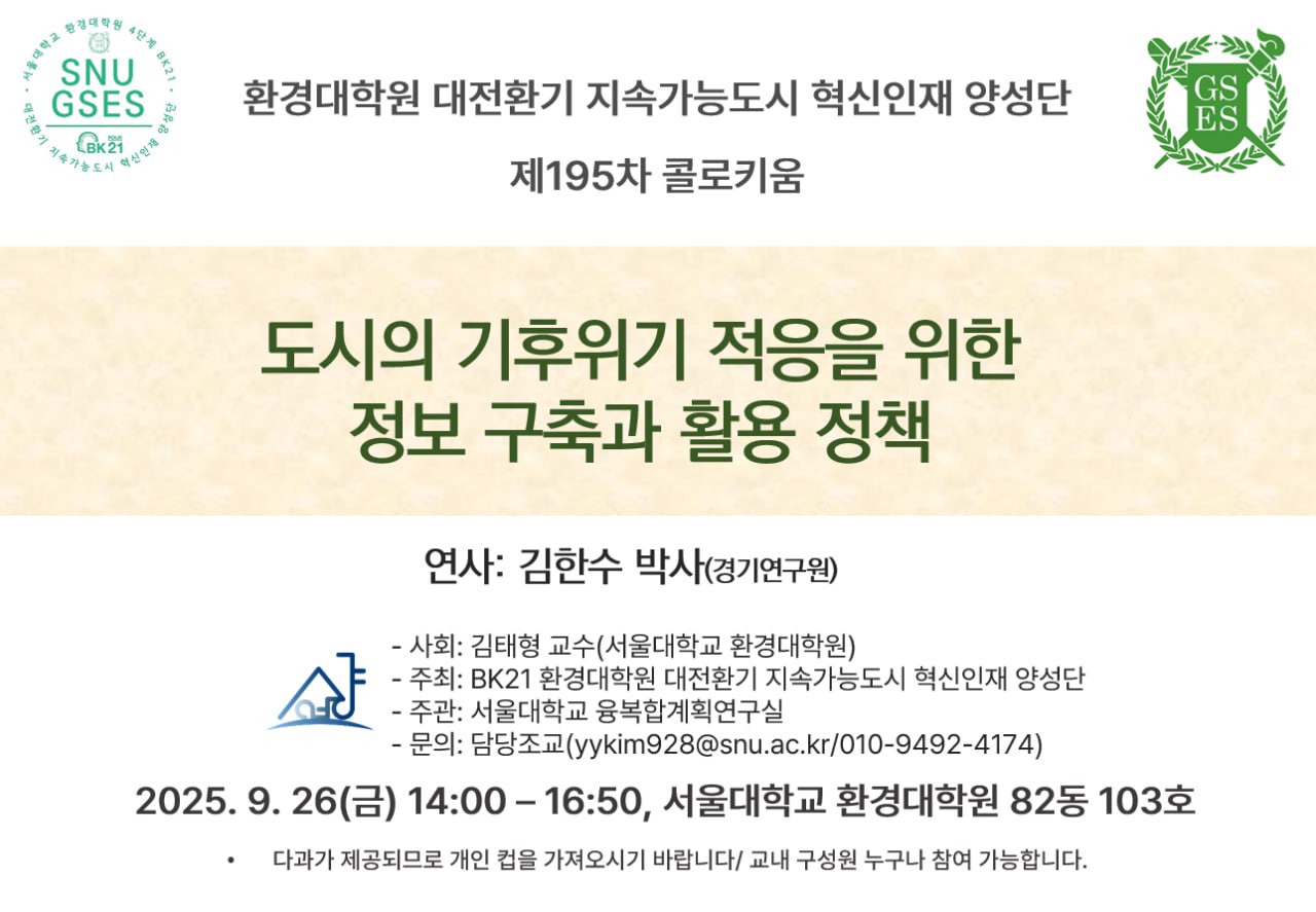 ㅇ 주최/주관: BK21 환경대학원 대전환기 지속가능도시 혁신인재 양성단 서울대학교 융복합계획연구실
