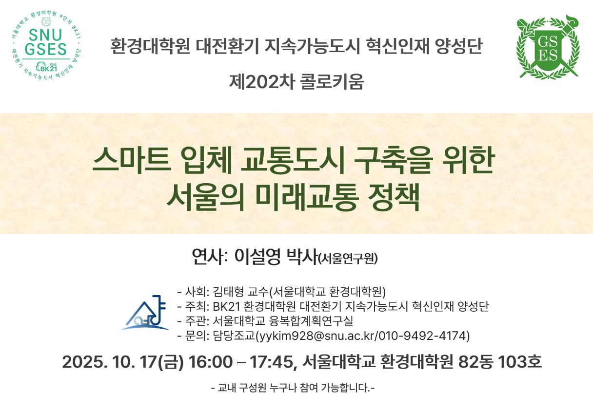 제202차 BK 콜로키움: 스마트 입체 교통도시 구축을 위한 서울의 미래교통 정책(이설영 박사 / 서울연구원)