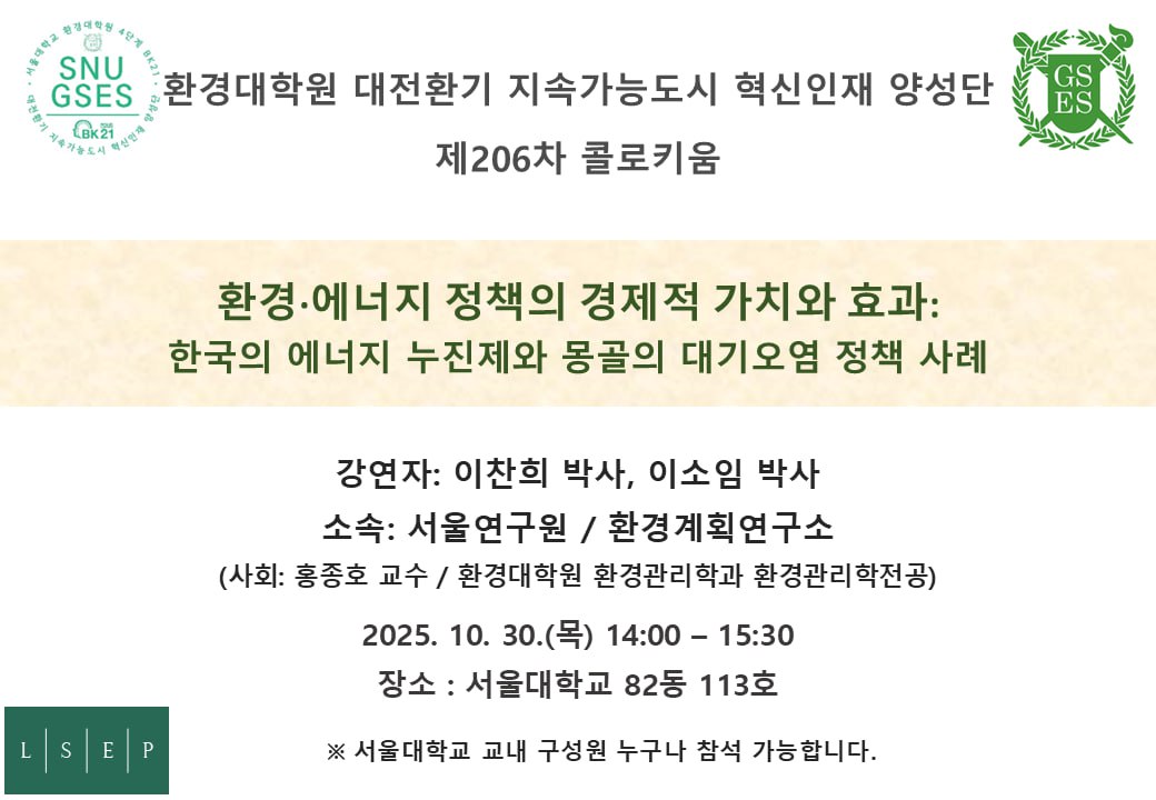 제206차 BK 콜로키움: 환경·에너지 정책의 경제적 가치와 효과: 한국의 에너지 누진제와 몽골의 대기오염 정책 사례(이찬희 박사/서울연구원, 이소임 박사/환경계획연구소)